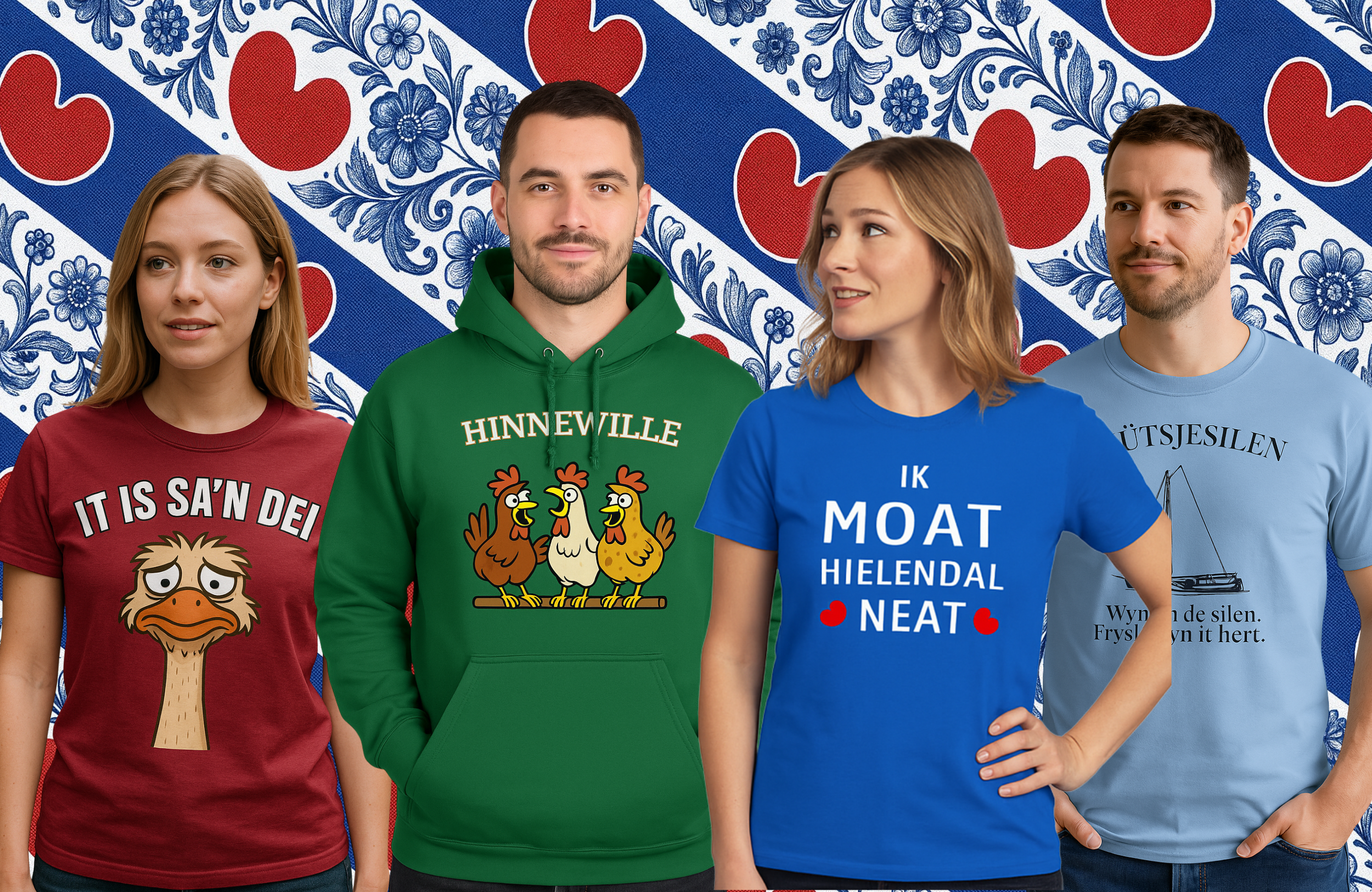 Bij Friese Creaties vind je originele T-shirts, warme hoodies, sweaters en cadeaus met Friese teksten, grappige uitspraken en het iconische pompeblêd-symbool. Elk ontwerp ademt Fryske trots en is perfect als cadeau of gewoon om zelf te dragen. Van humor tot stijlvol en van zomers tot winters – onze collectie laat je altijd een stukje Fryslân bij je dragen. Gratis verzending vanaf €50 en snelle levering door heel Nederland.