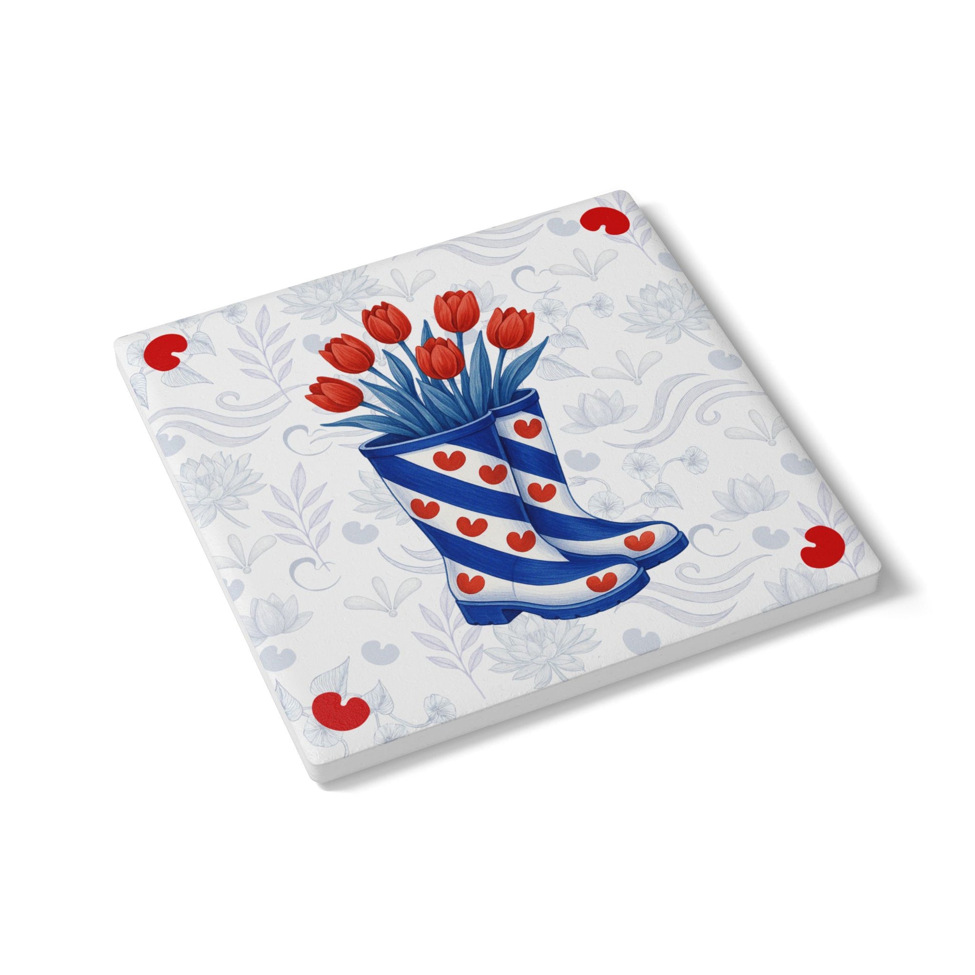 Breng een vleugje Friese charme op tafel met deze keramische onderzetter in Delftsblauwe stijl. De illustratie toont een speelse laars gevuld met rode tulpen, versierd met herkenbare pompeblêden – een subtiele knipoog naar de Friese vlag en het buitenleven.