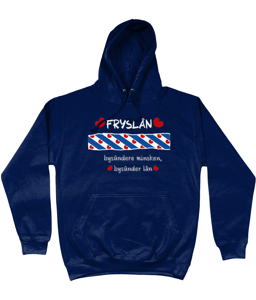 De voorkant van het hoodie is voorzien van een unieke print met de trotse tekst "Fryslân", omgeven door kleine rode pompeblêden. Onder de Friese vlag staat de inspirerende tekst "bysûndere minsken, bysûnder lân", wat de sterke verbondenheid met het bijzondere Friese land en zijn mensen uitstraalt.