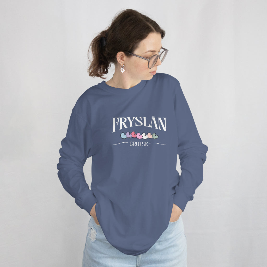 Deze comfortabele sweater is een must-have voor elke Friesland-liefhebber! Op de voorkant prijkt groot het woord Fryslân, met daaronder zeven kleurrijke pompeblêden. Als subtiele finishing touch staat eronder in kleine letters grutsk – want trots op Fryslân ben je altijd!