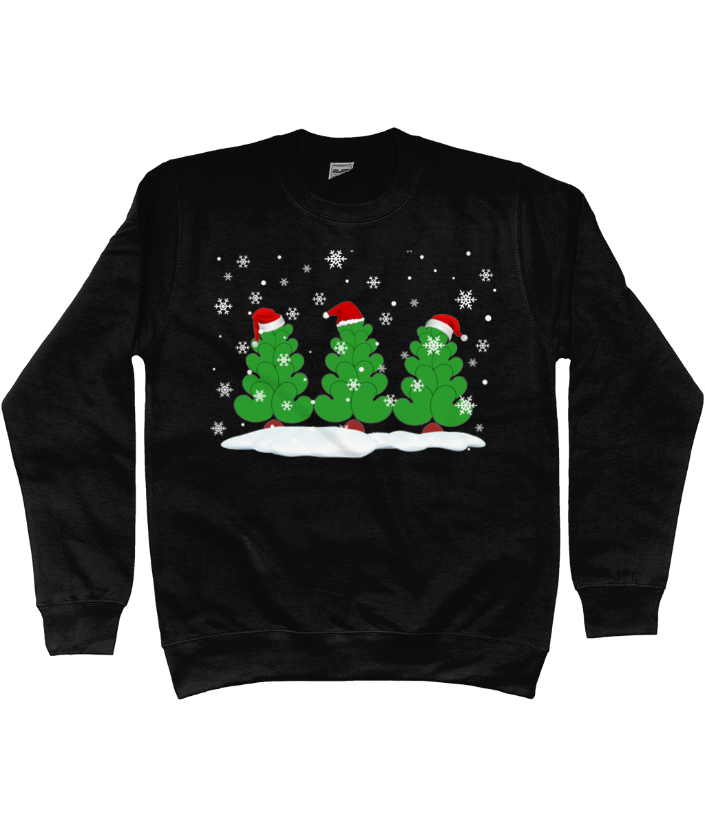 Breng een vleugje Fryslân naar de feestdagen met deze gezellige kersttrui! Het ontwerp toont drie groene kerstbomen, prachtig opgebouwd uit pompeblêden, met elk een vrolijke kerstmuts als piek.